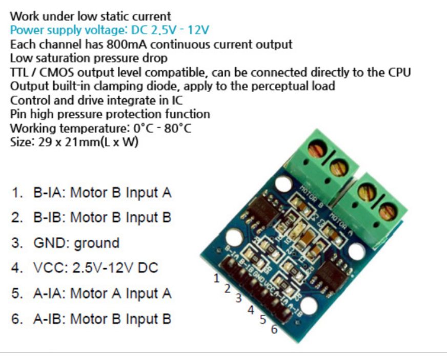 * 1.5V * 3 사용시 앞으로 전진 양호 / 후진 양호 / 왼쪽(오른쪽모터동작)양호/ 오른쪽(왼쪽모터 동작) 불량: 기어나사가 헛돈다)
