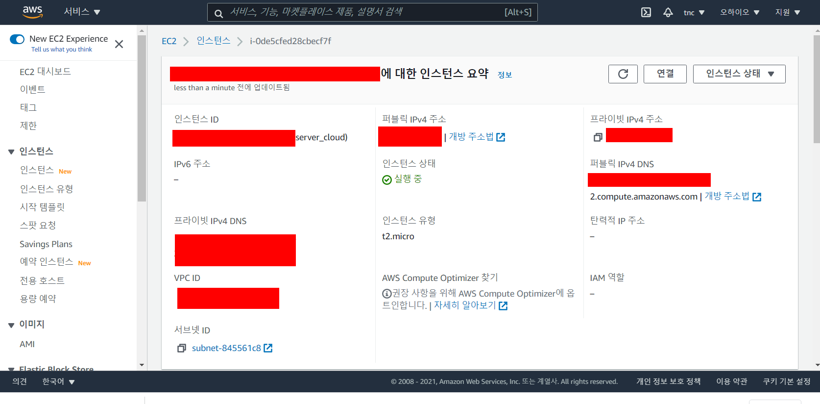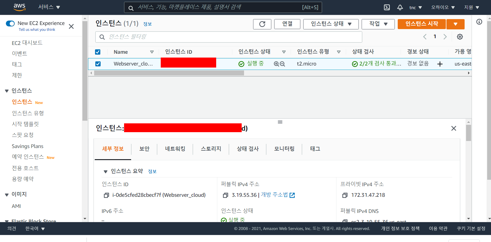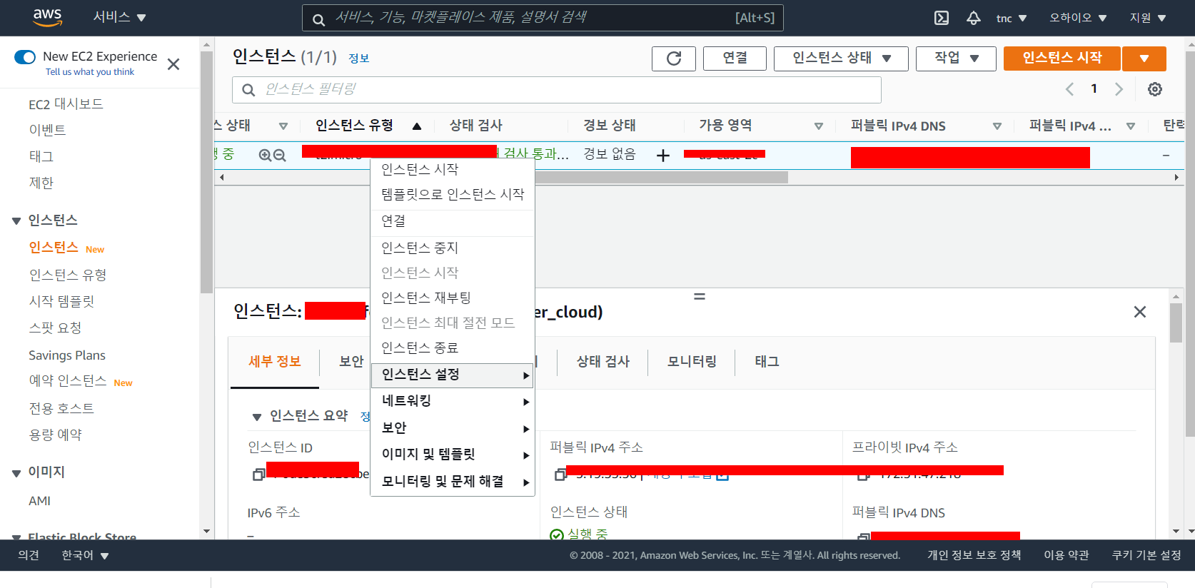 인스턴스 ID의 본인의 파란색으로 된 아이디를 클릭하면 다음과 같은 화면으로 전환됩니다.