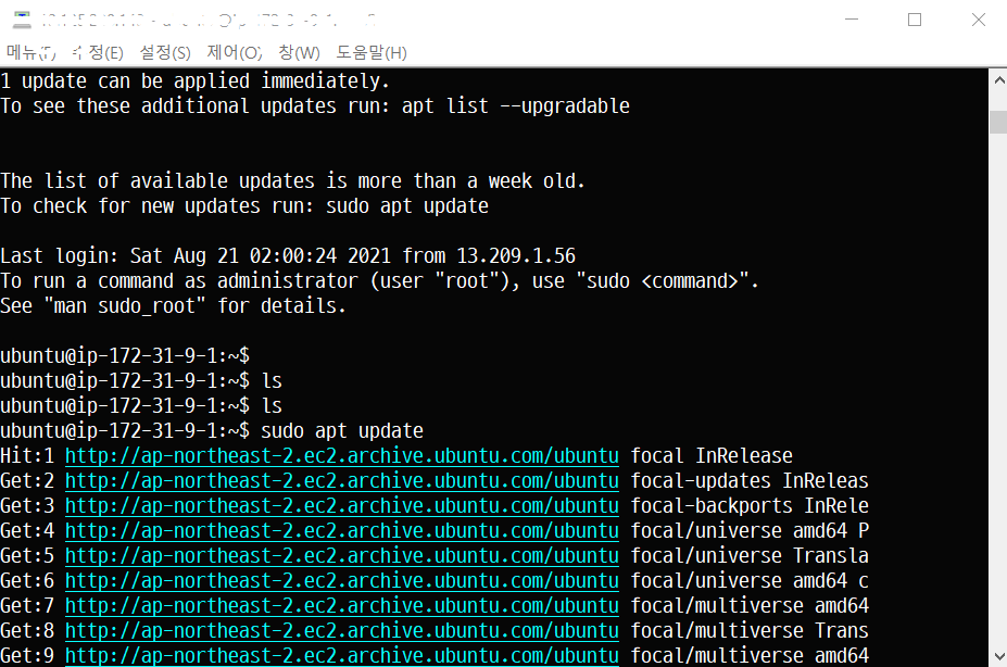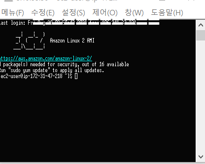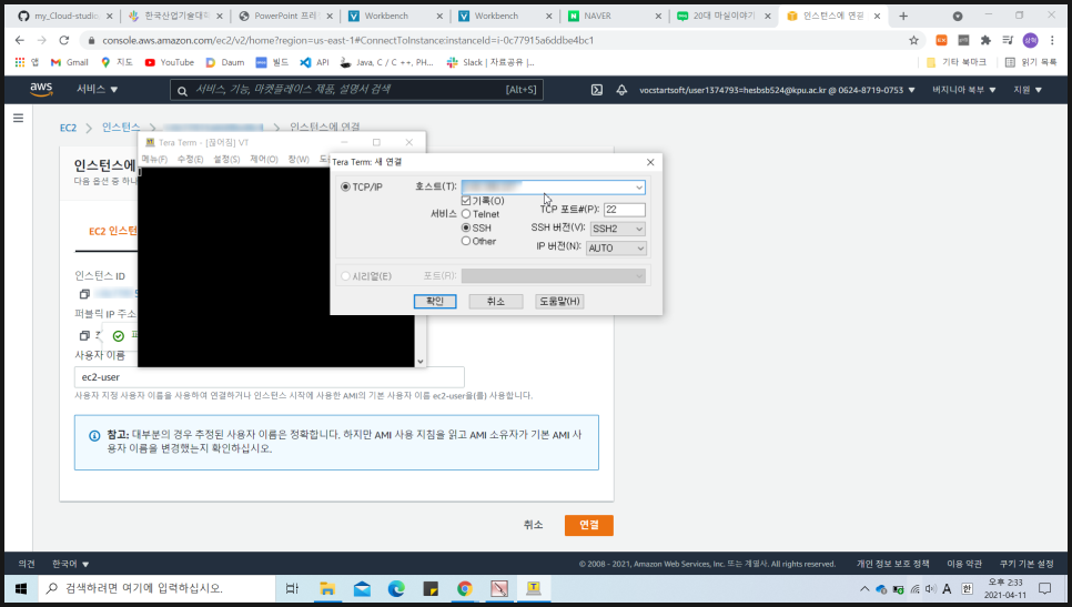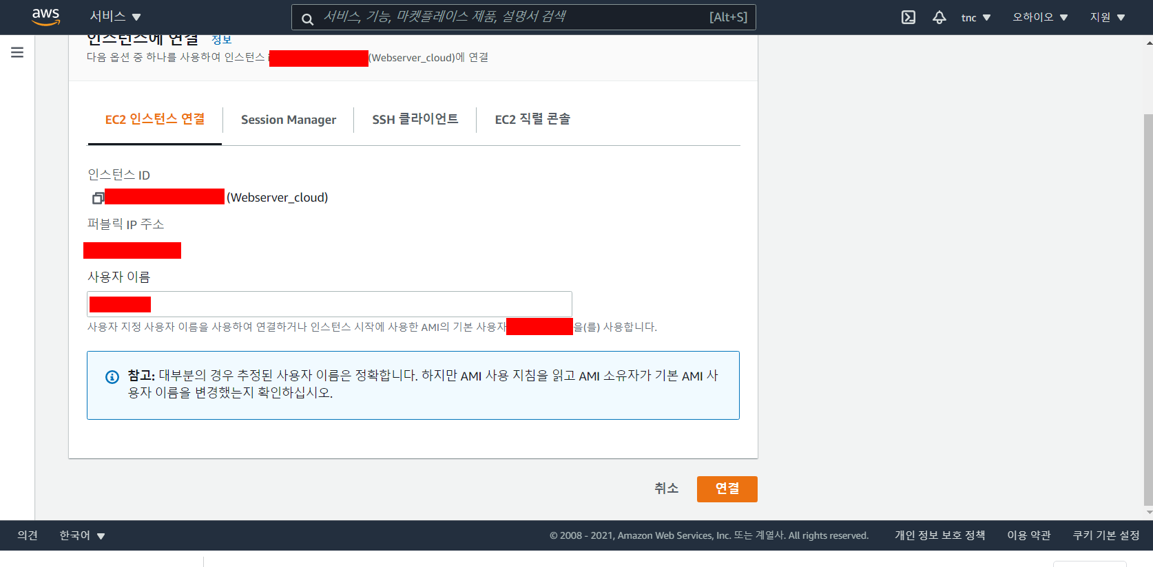 인스턴스에 연결하는 단계입니다. 퍼블릭ip주소를 한번 더 확인할 수 있고, 사용자의 이름을 볼 수 있습니다.