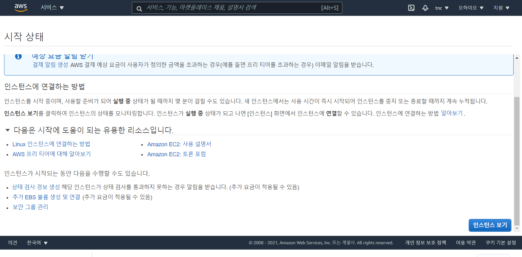 이상이 없다면, 계속 스크롤을 내려 인스턴스 보기를 클릭합니다.
