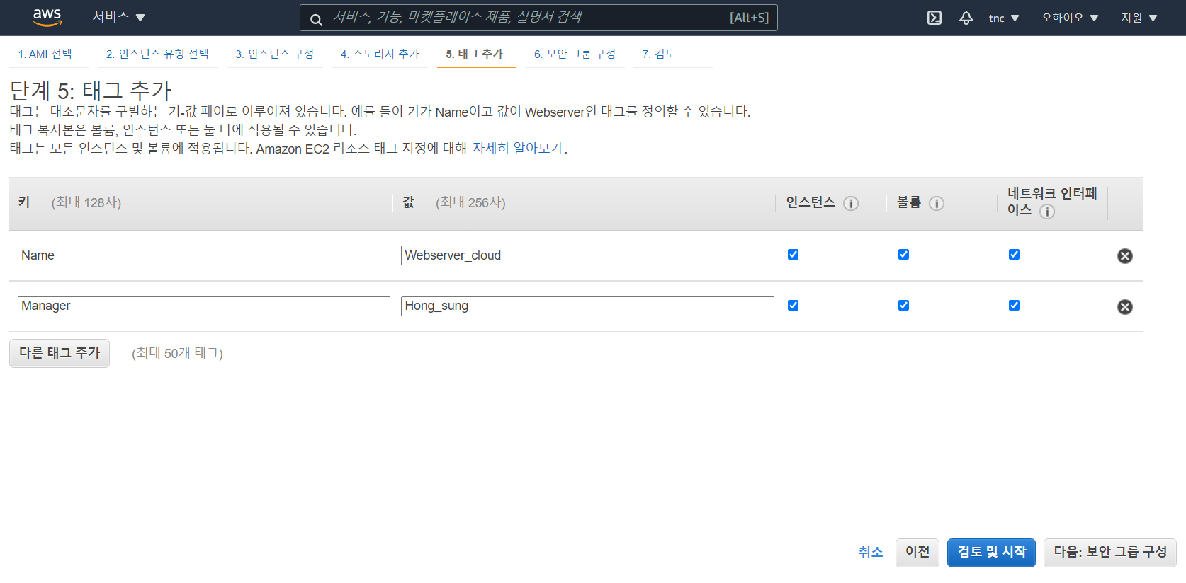 키와 값은 본인이 용도에 따라 원하는 것으로 설정하시면 됩니다. 설정하셧다면, 다음:보안 그룹 구성을 클릭해주세요.