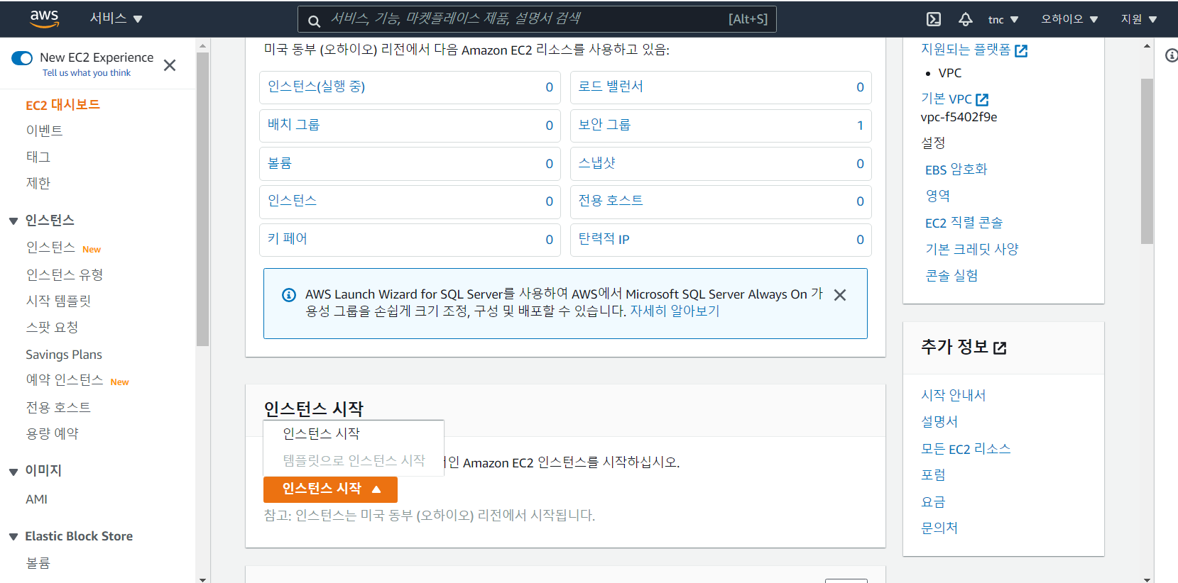 1. EC2대시 보드에서 인스턴스 시작 버튼을 누른다.