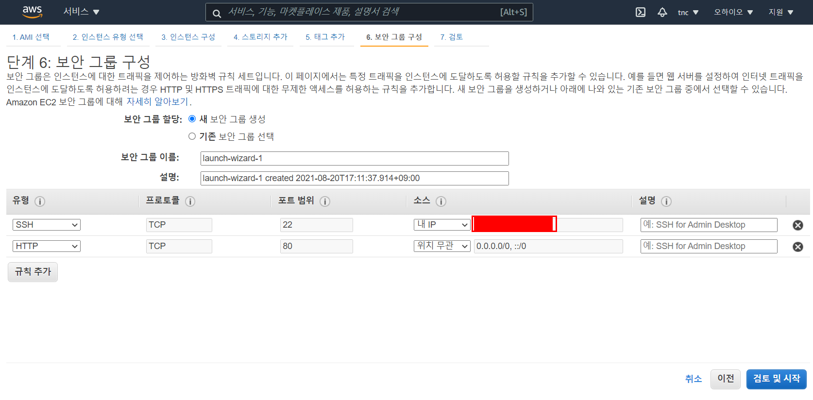 - 보안 그룹 할당 : [ 새 보안 그룹 생성 ] 하여 추후 새로 만들 서버들에게도 동시에 적용 가능합니다.