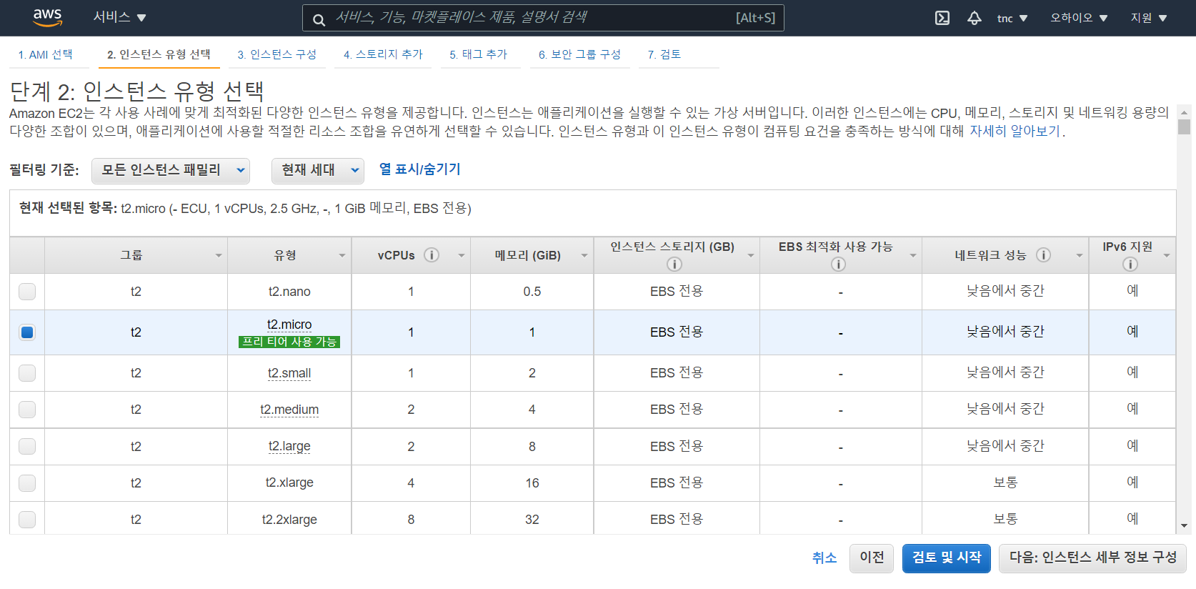 3. 인스턴스 유형 선택 단계인데요. 검토 및 시작을 누르지 마세요~~