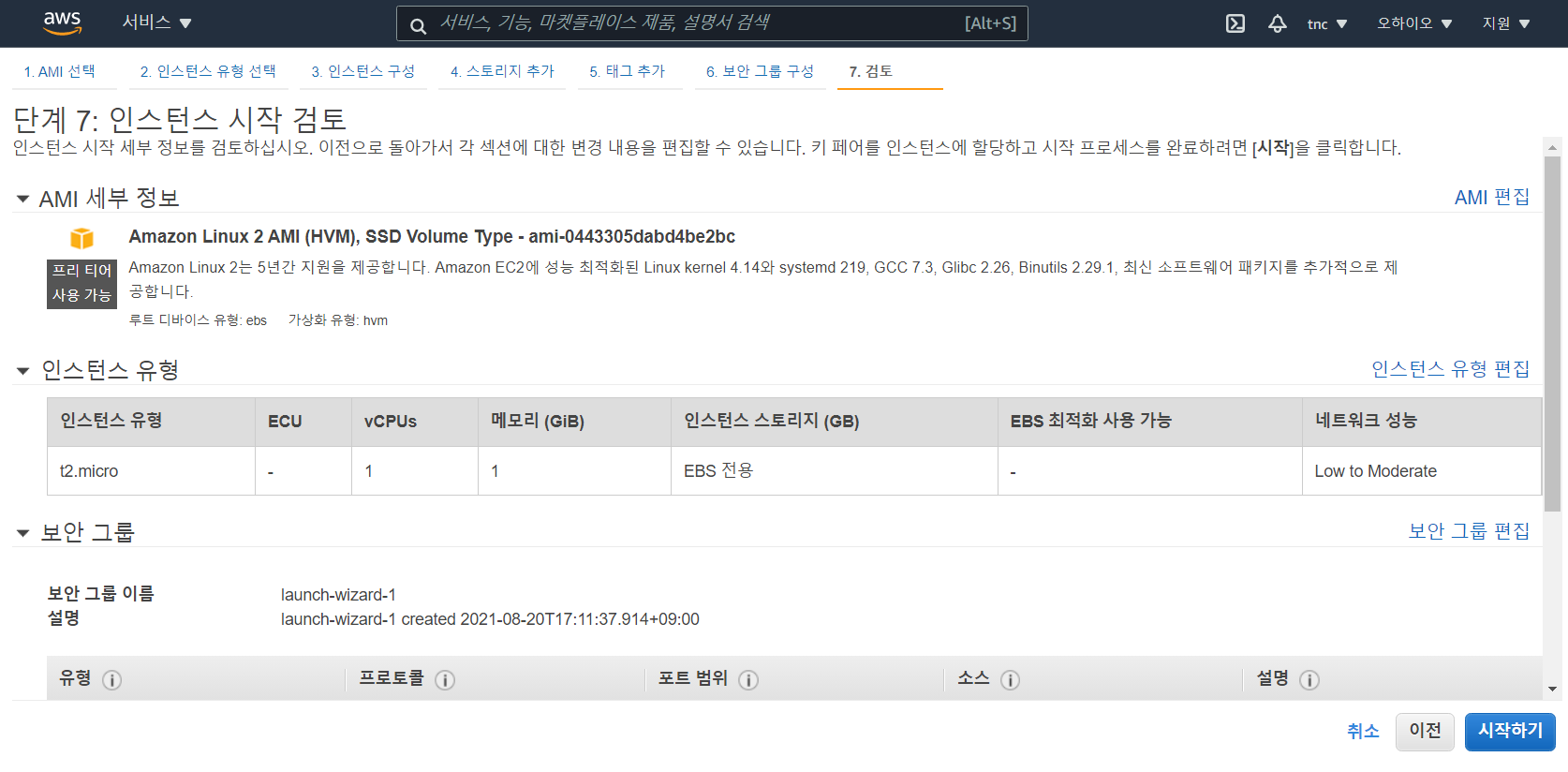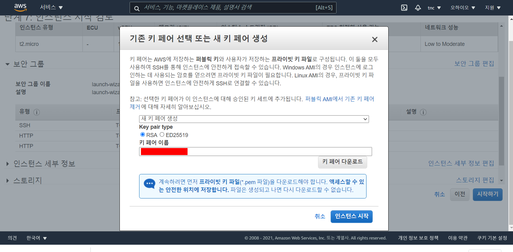 키 페어 이름 설정을 완료하셨다면 인스턴스 시작을 눌러줍니다.