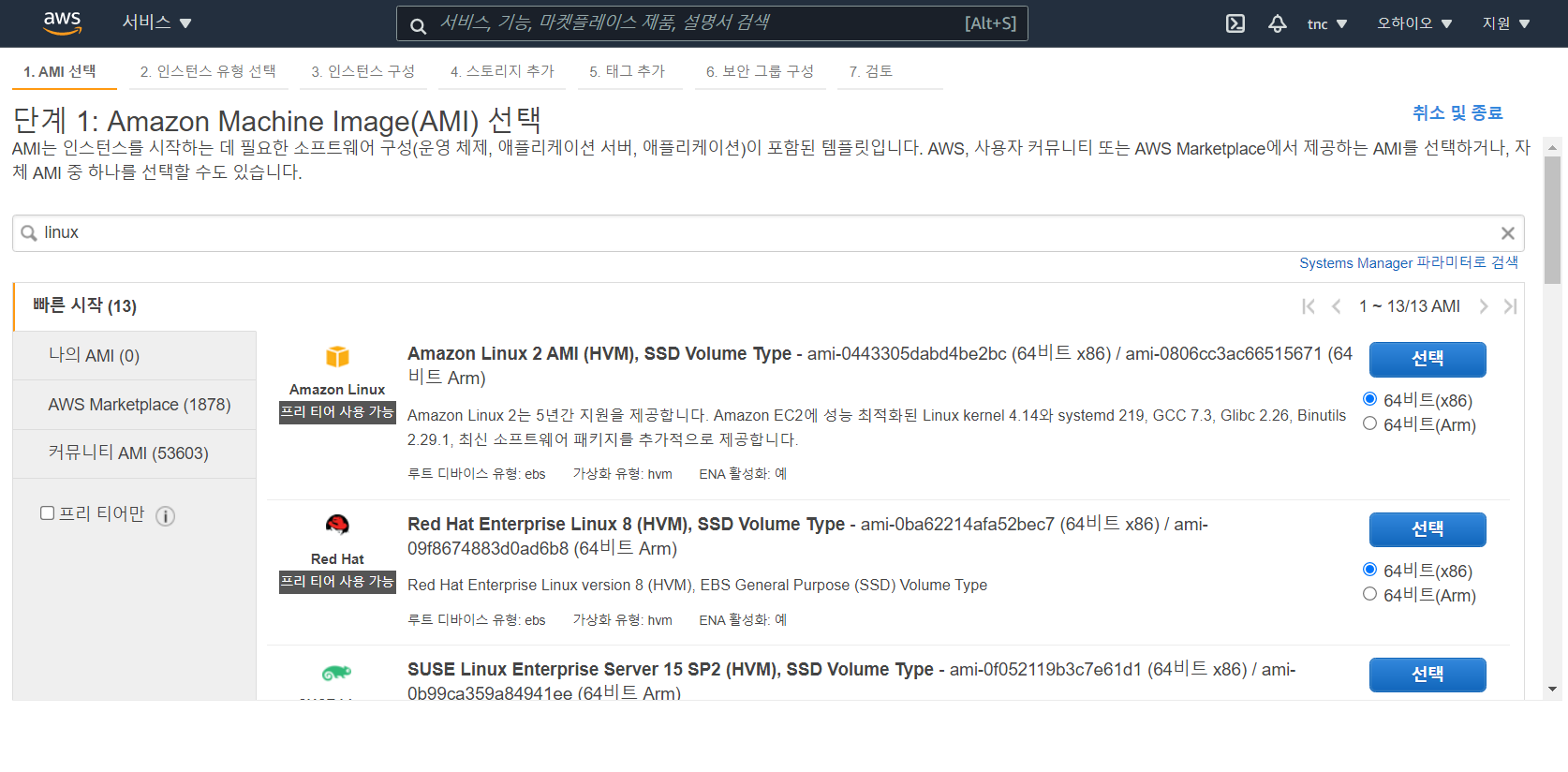 AMI를 찾는데, 우리는 검색에서 linux를 검색하고, Amazon Linux 2 AMI를 선택하면 되구,