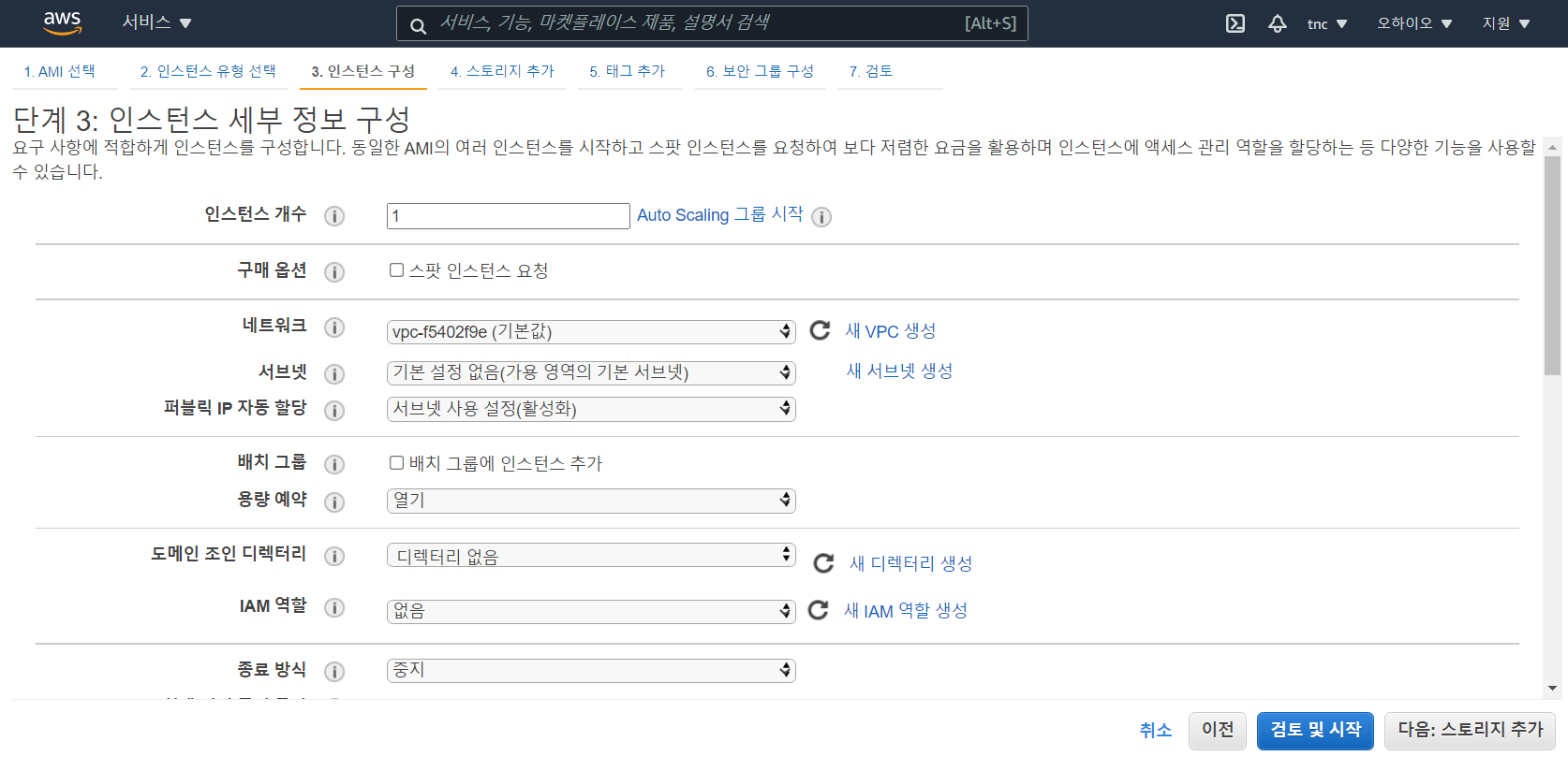 4.인스턴스 세부 정보를 구성하는 단계입니다. 여기서는 인스턴스 개수를 설정할 수 있고, 네트워크 설정 및 종료 방식, 크레딧 사양 설정, 엑셀러레이터 등을 추가 할 수 있습니다.