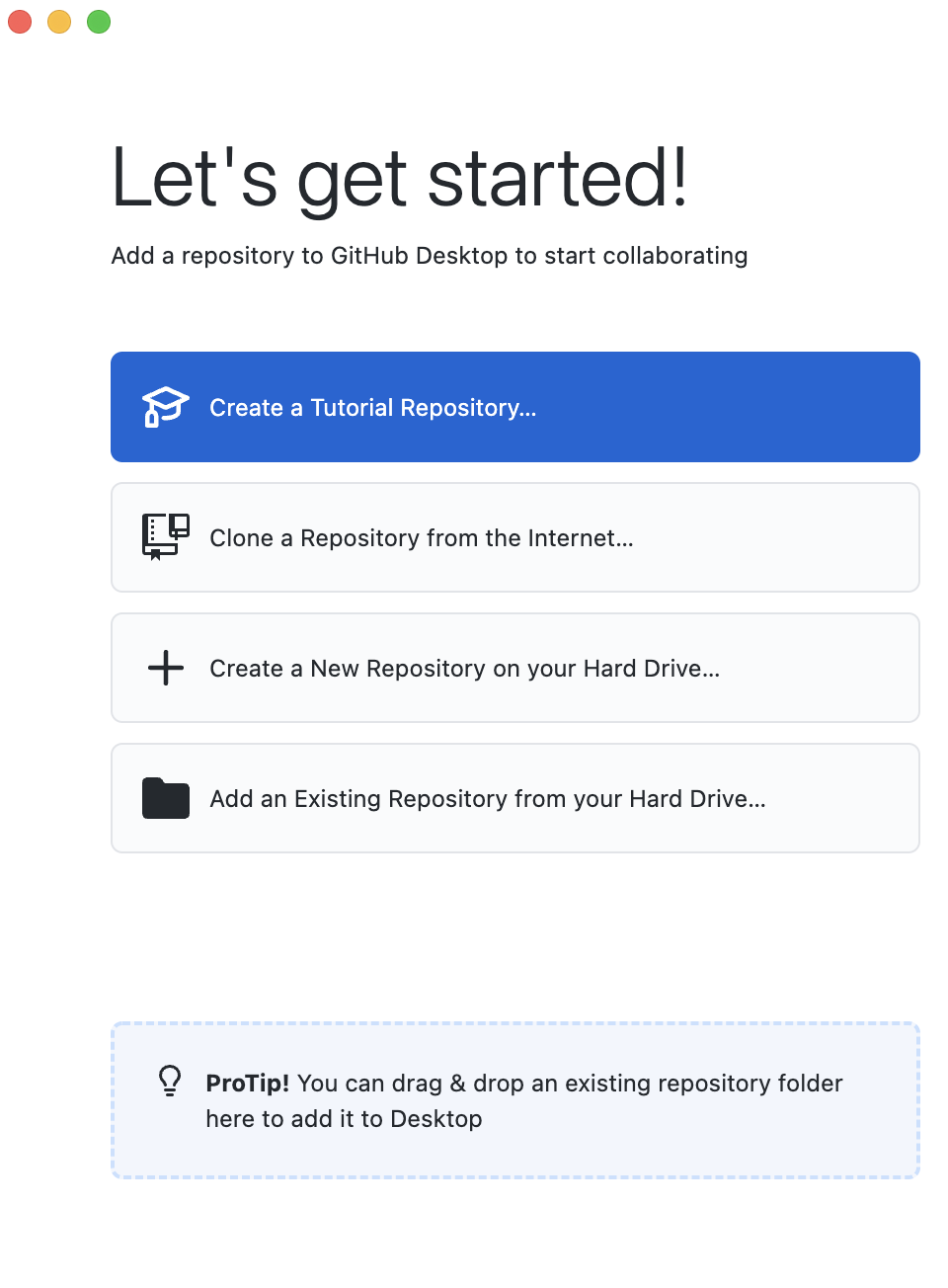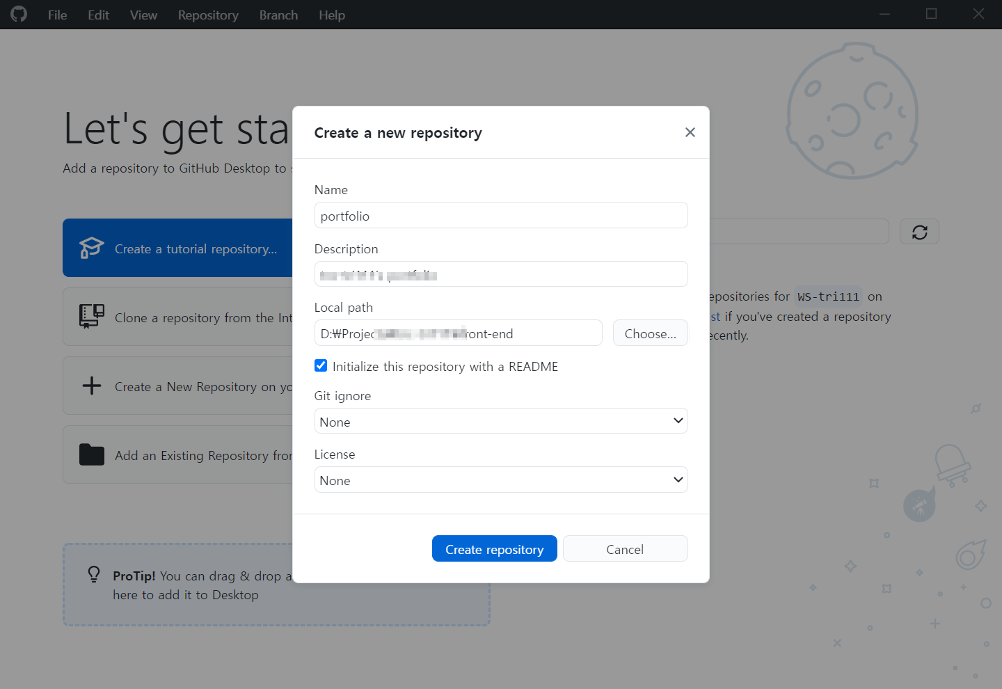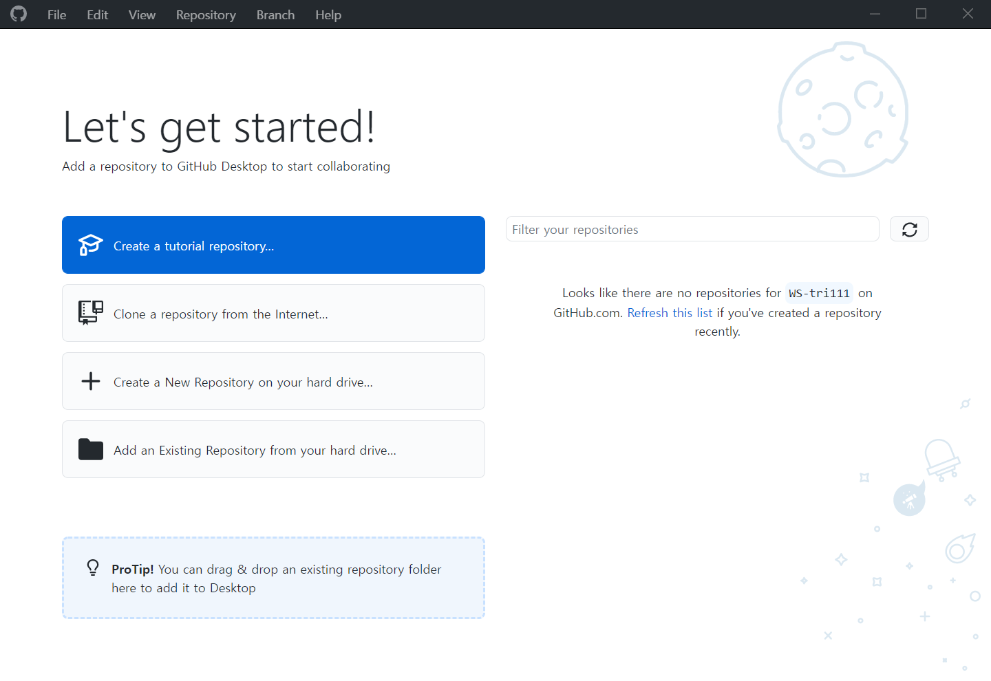 3. 설치 후 새로운 Repository 생성 (Create a New Repository on your hard drive....)