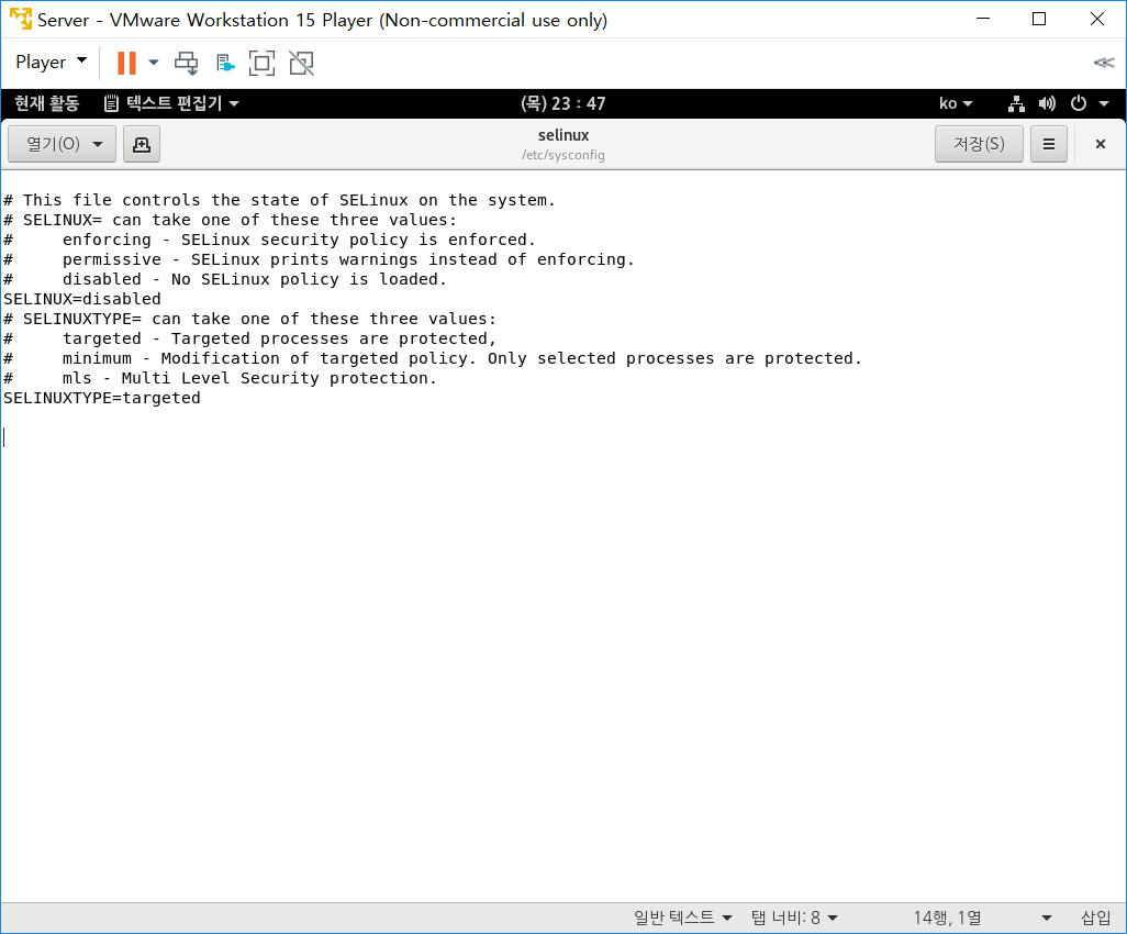 터미널에서 다음 명령을 입력해 SELinux 설정파일을 편집 한다.