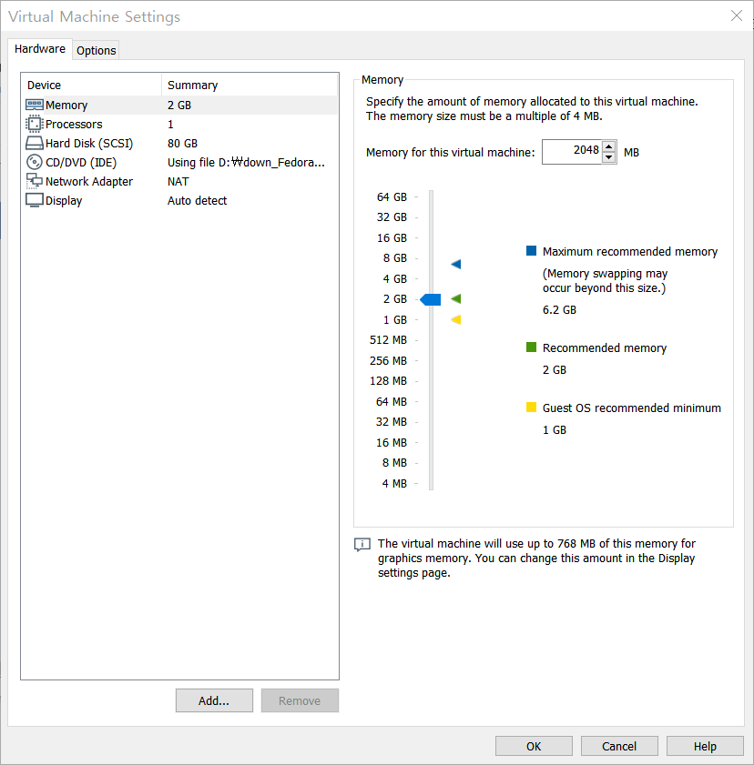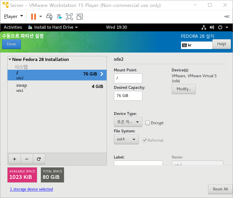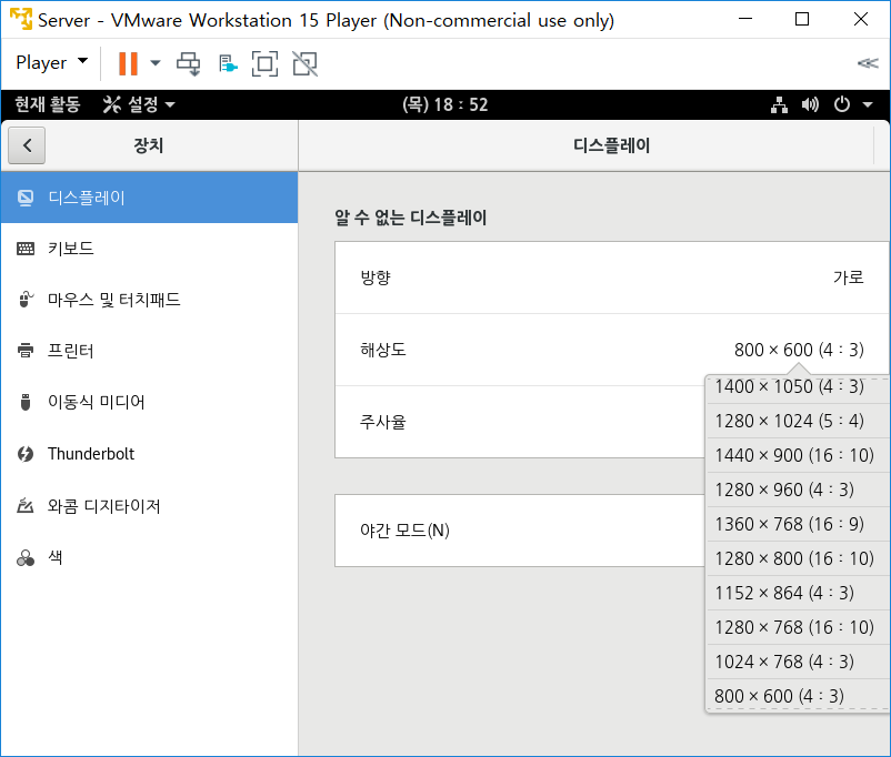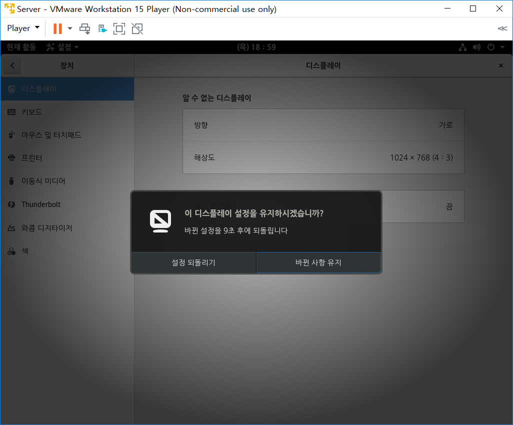 화면의 해상도를 1024*768 로 변경했으나, Fedora 28과 VMware의 충돌로 인해서 해상도가 계속 800*600으로 설정될수 있다