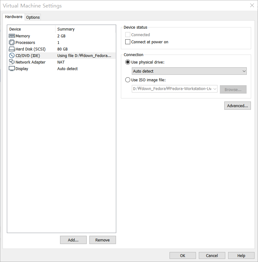 다음 화면과 같이 CD/DVD(IDE)를 선택하고 다운로드한 'Fedora-Workstation-Live-x86_64-28-1.1.iso' 파일을