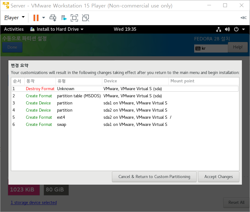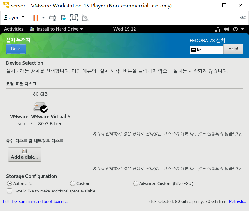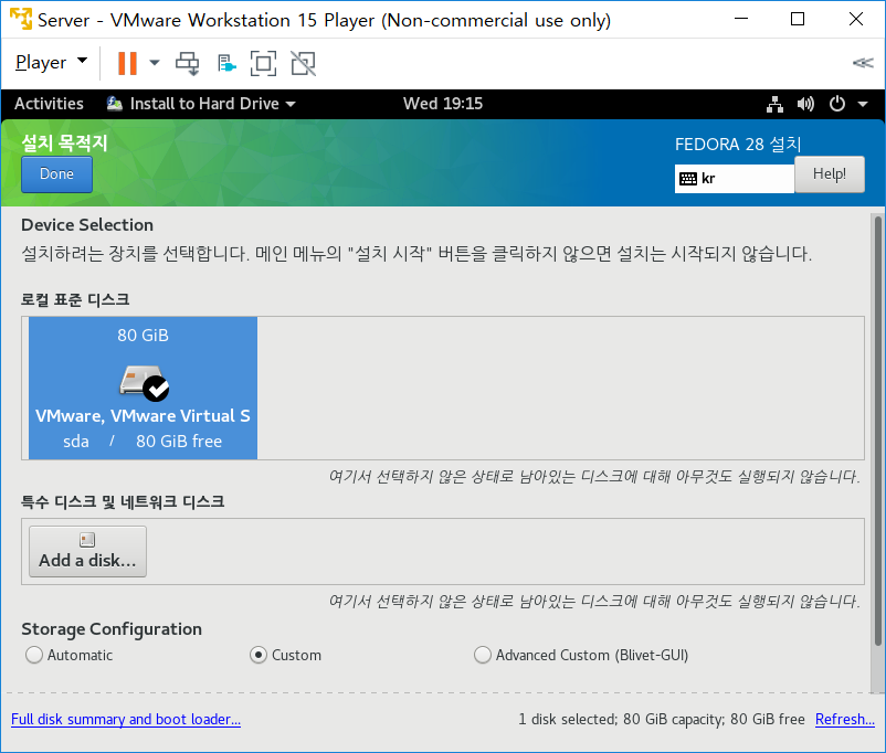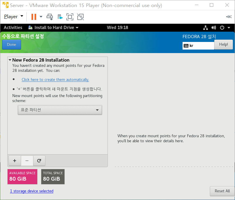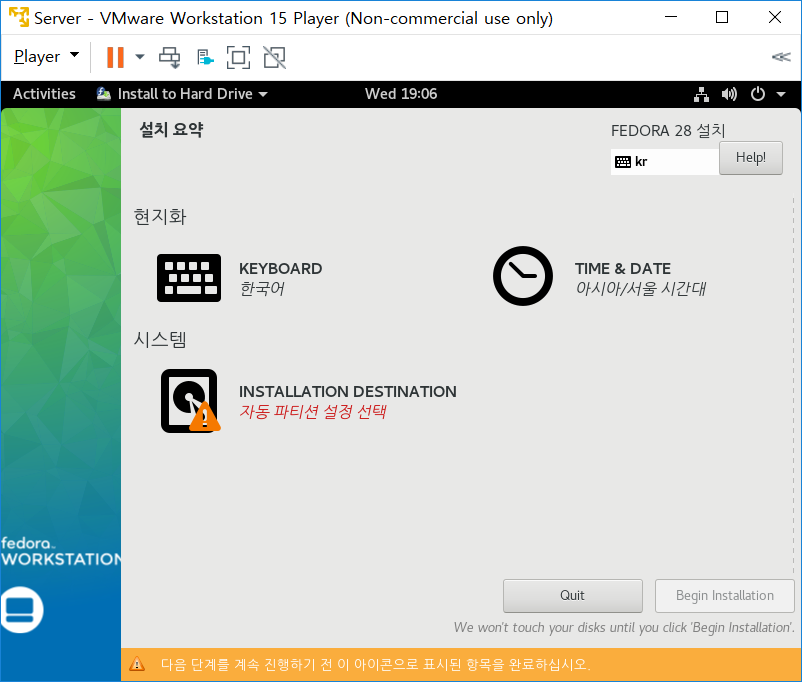 [설치 요약]이 나온다 [INSTALLATION DESTINATION] 부분을 확인하면 [자동 파티션 설정 선택]으로 되어 있을것이다.