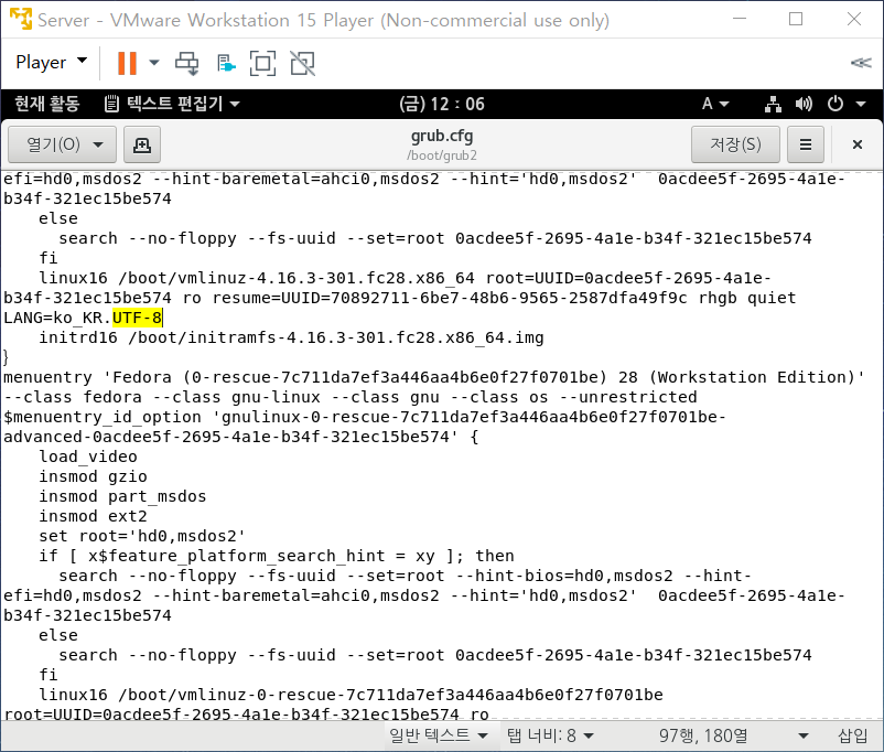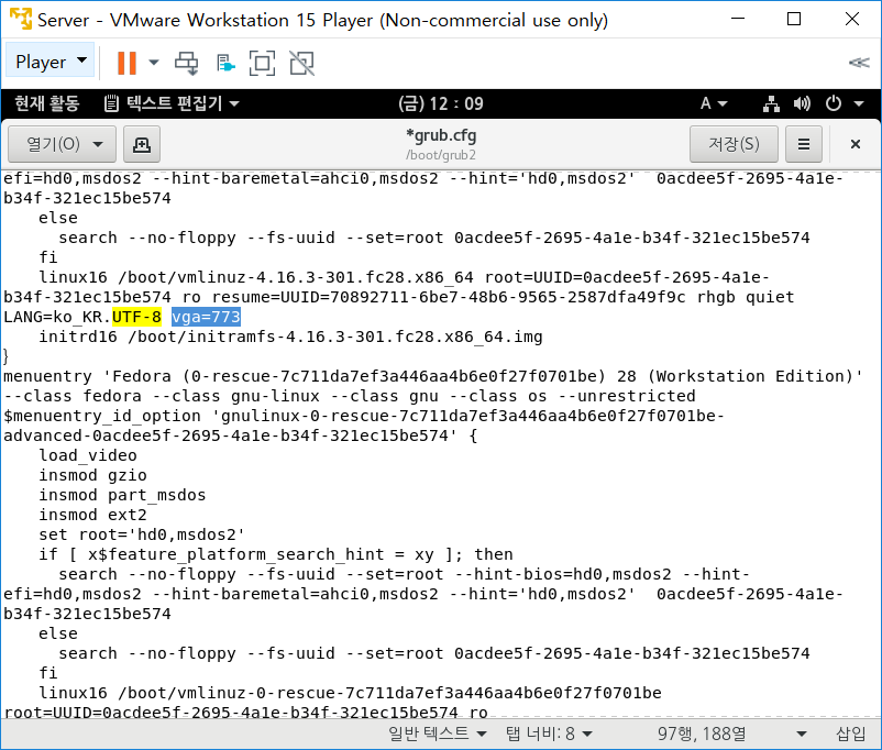 아래와 같이 UTF-8 다음에 'vga=773' 입력후 저장한다.