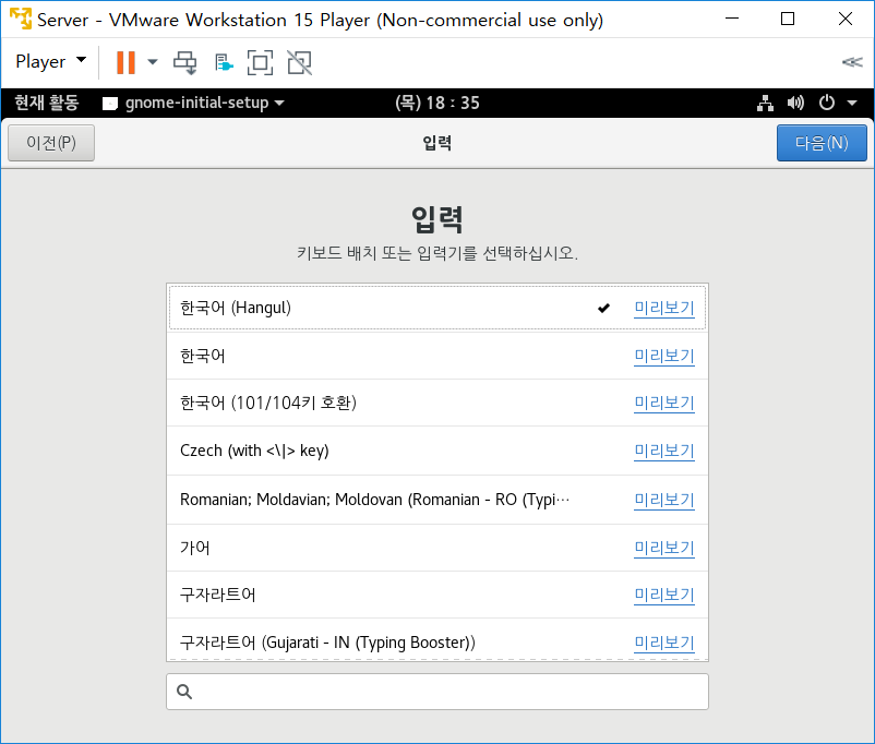그놈(GNOME)의 초기 설정 화면이 나오고 언어 선택 화면이 등장한다. [한국어]선택후 <다음>을 클릭한다.