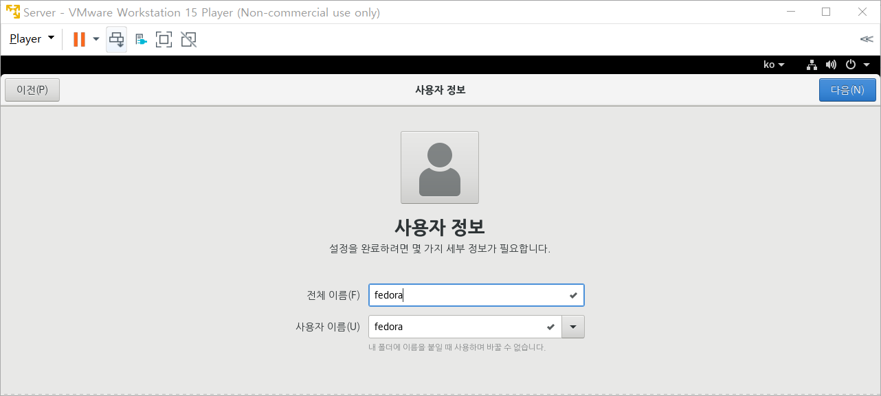 [사용자 정보]에서 추가로 사용자를 생성해야 한다. 전체 이름과 사용자 이름에 모두 'fedora'를 입력하고 <다음>을 클릭한다.