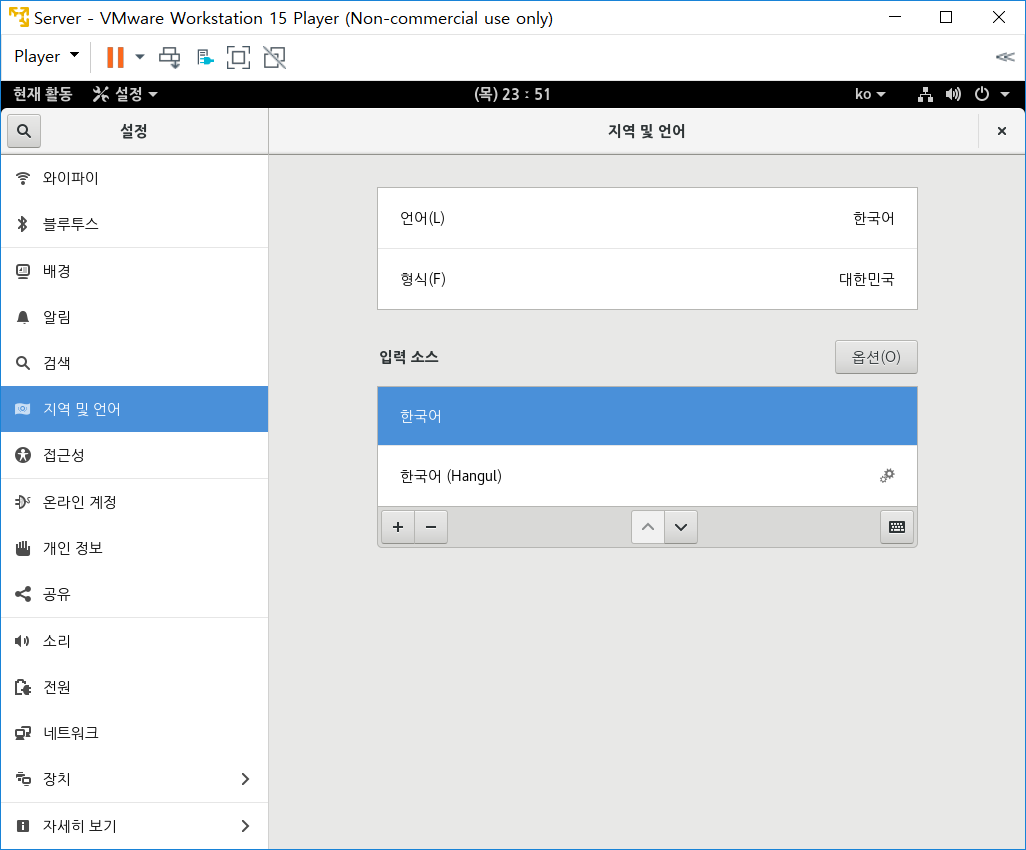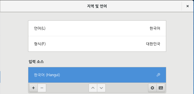 [지역 및 언어]를 선택하고 [입력소스]의 [한국어]를 선택하고 <-> 를 클릭해서 삭제한다.