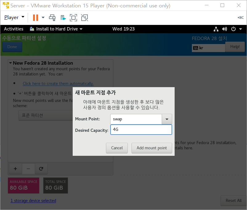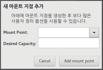 <Add mount point>를 클릭한다. 그러면 4GB를 제외한 나머지 용량이 루트 파티션(/)에 할당된다.