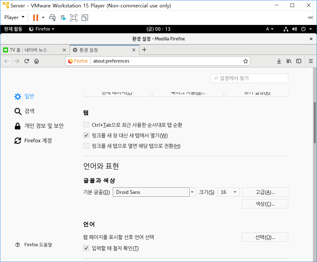 [기본글꼴]을 [Droid Sans]로 변경한 후 [환경 설정]창을 닫는다.