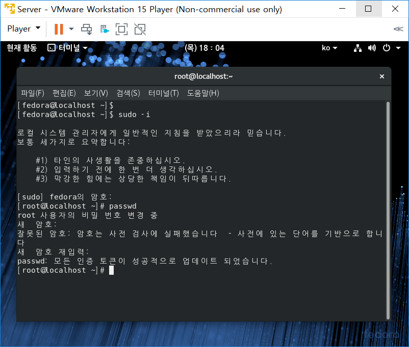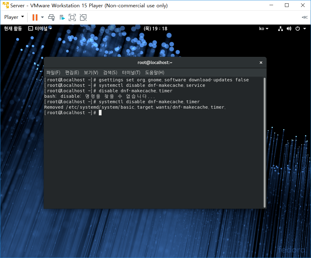 이제부터 Fedora 28의 소프트웨어가 업데이트되지 않는다. exit 명령을 입력해서 터미널을 닫자.