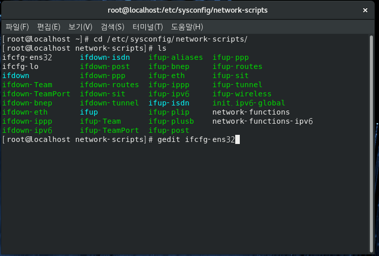 ifconfig ens32 ( 또는 그냥 ifconfig 만 입력해서 확인) → 네트워크 정보 확인
