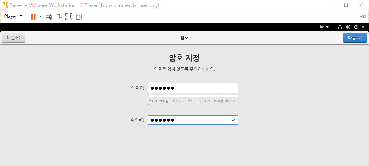 [암호 지정]에서 앞에서 만든 fedora 사용자의 암호를 지정한다. 잊어버리지 않도록 암호도 'fedora'로 지정하고