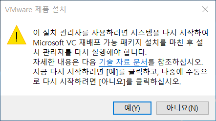 혹 아래와 같은 창이 뜨면 예(Y) 버튼 클릭후 재부팅하고 다시 다운 받은 파일을 실행한다.