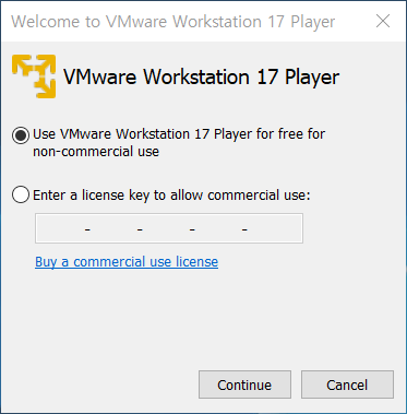 15. VMware Workstation 아이콘 클릭하면 다음과 같은 창이 뜬면, Continue 버튼 클릭한다.