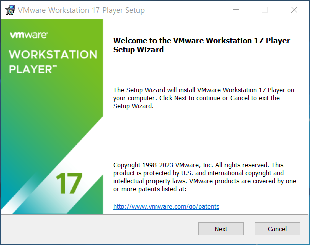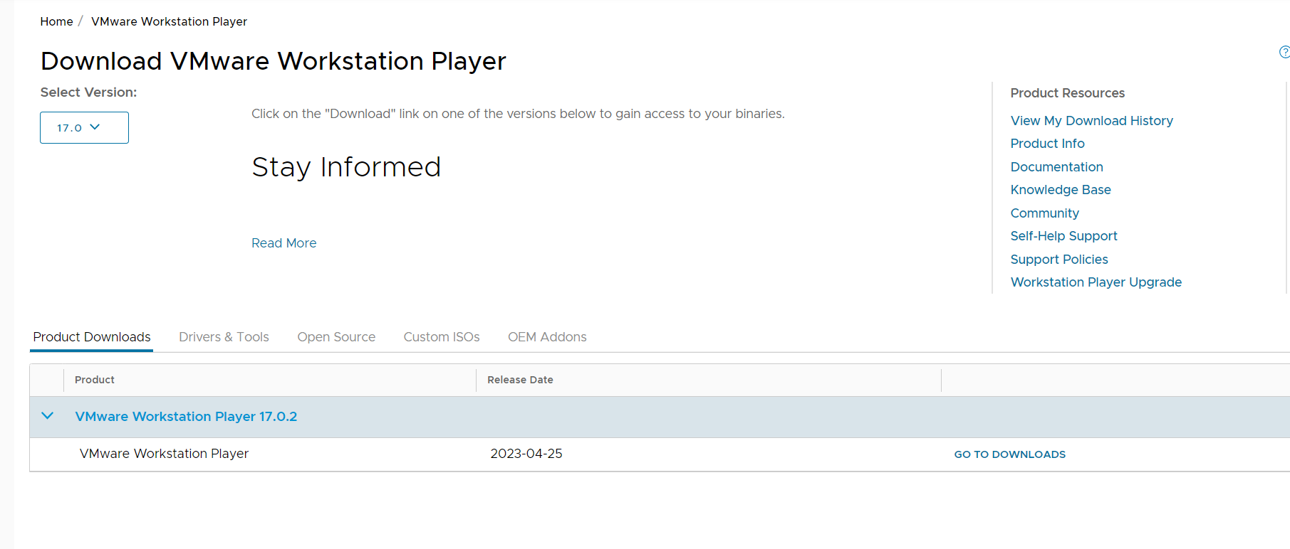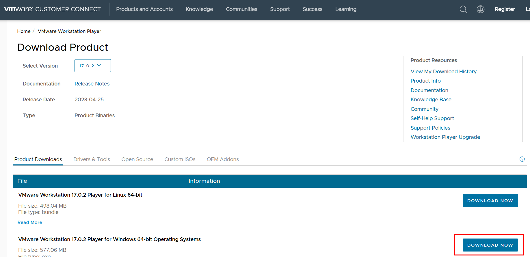 VMware Workstation 17.0.2 Player for Windows 64-bit Operating Systems 을 선택하여 다운로드 받는다.