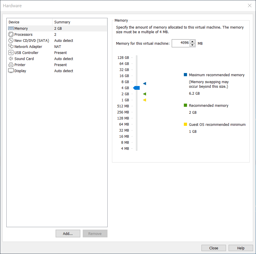 8) 다음과 같은 창이 나온다. (메모리2G를 4G 로 변경한다. : 파란색 게이지를 이동시켜서 변경한다.) <close> 클릭한다.