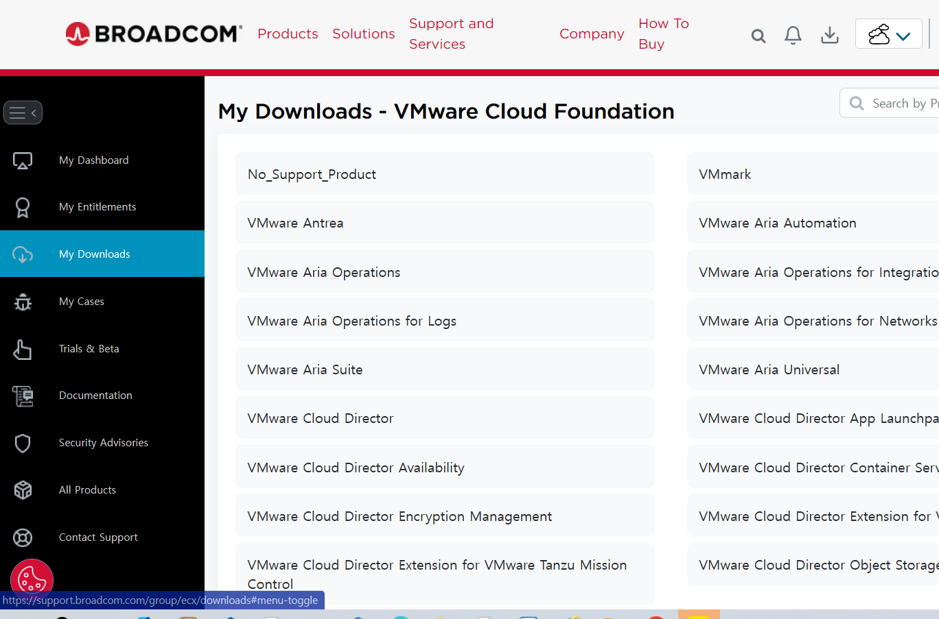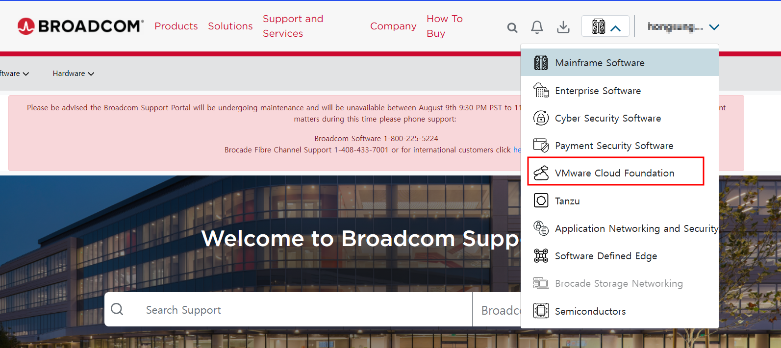 1)왼쪽 상단 BROADCOM 클릭 2) 오른쪽 상단 Support Portal 클릭 후 GO TO Portal 버튼 클릭