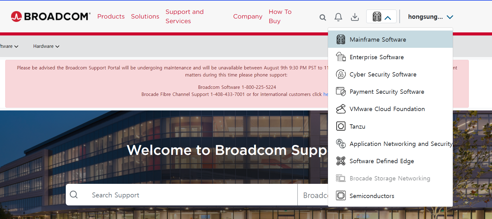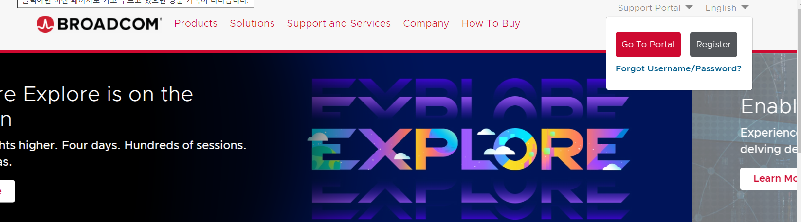 1)왼쪽 상단 BROADCOM 클릭 2) 오른쪽 상단 Support Portal 클릭 후 GO TO Portal 버튼 클릭