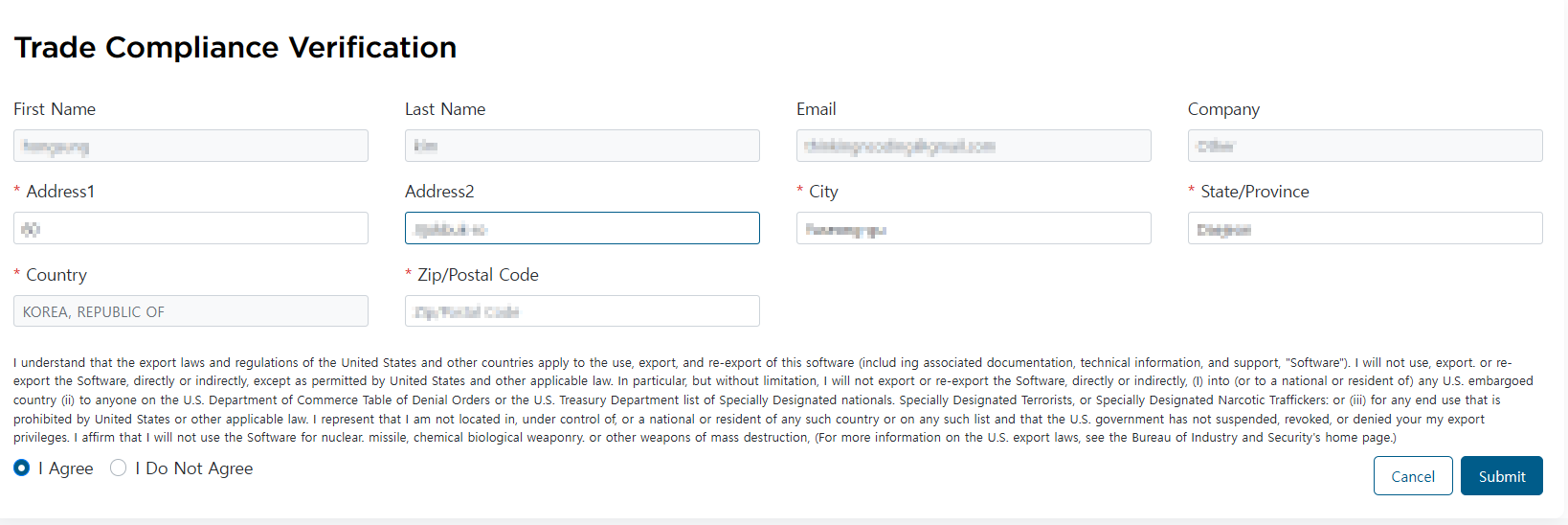 10. 이름과 주소 정보를 입력한다. I agree 체크후 submit 버튼 클릭 한다.