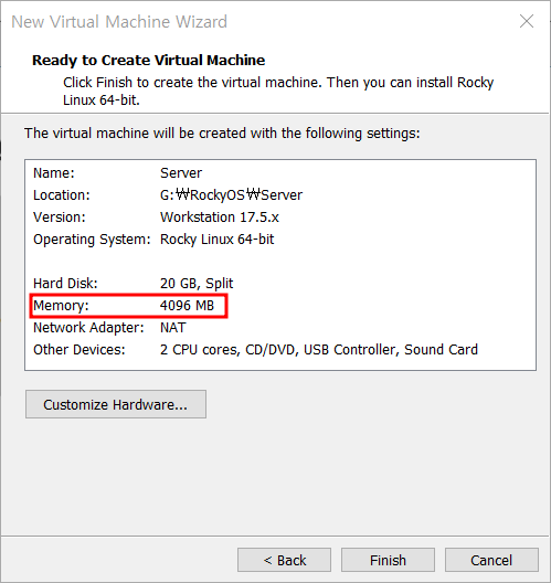 11. Memory 변경된거 확인후 <Finish> 클릭한다.