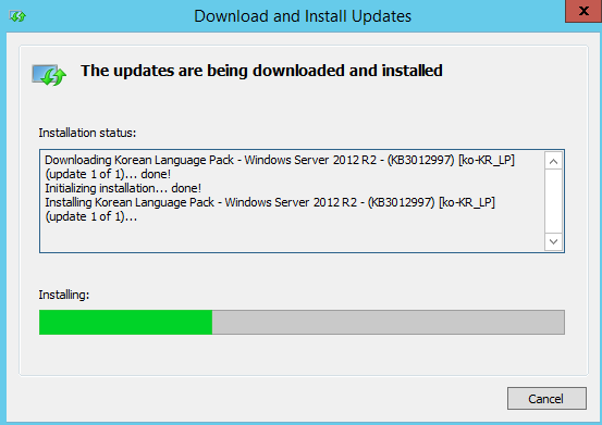 17. 정상적으로 다운로드가 진행되면 다음과 같이 녹색바가 보일 것이다. 다운로드 후 설치까지는 약 10~20분의 시간이 소요된다. 설치가 완료되면 <Close>를 클릭한다.