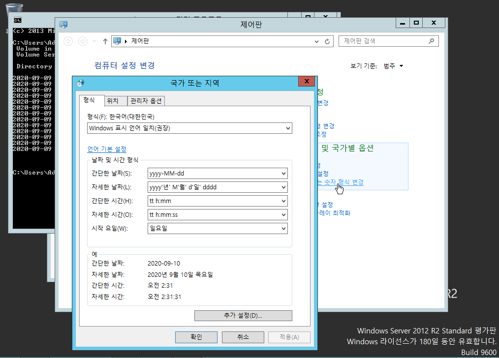윈도우 [시작] 버튼에서 마우스 오른쪽 버튼을 눌러 [제어판]을 선택한후 [날짜, 시간 또는 숫자 형식 변경]을 클릭한다.