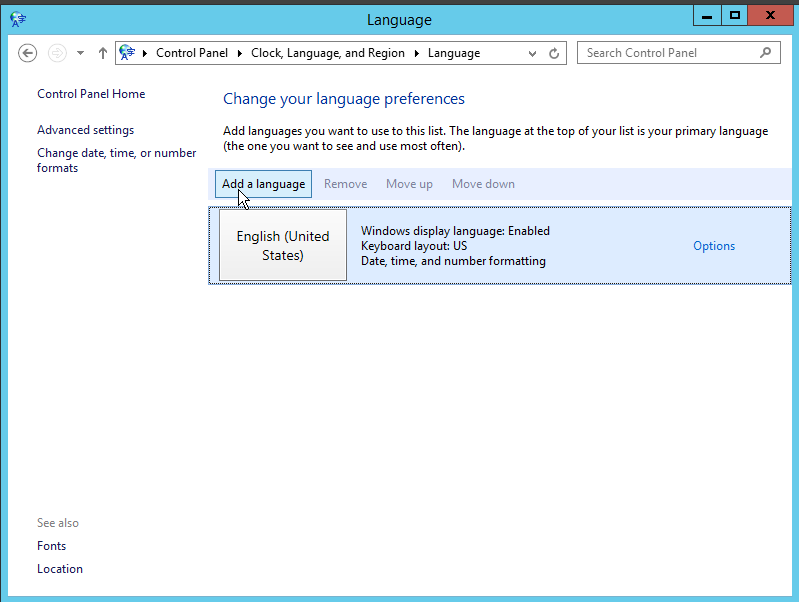 Clock, Language, and Region 아래의 [Add a language] 를 클릭한 후