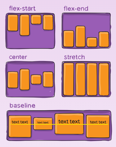 align-items: stretch | flex-start | flex-end | center | baseline | first baseline | last baseline | start | end | self-start | self-end + ... safe | unsafe;