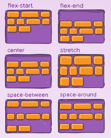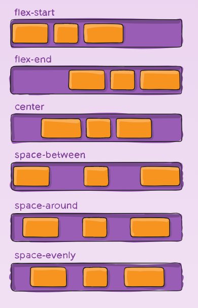 justify-content: flex-start | flex-end | center | space-between | space-around | space-evenly | start | end | left | right ... + safe | unsafe;