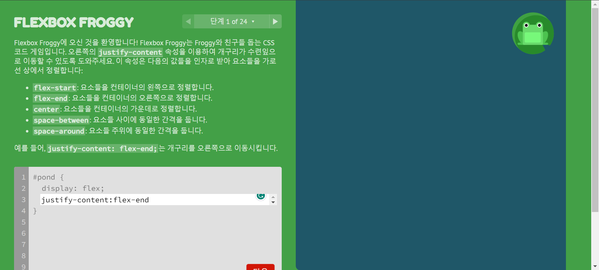 FLEXBOX FROGGY https://flexboxfroggy.com/#ko flex box 연습 게임 입니다. 단계별 연습문제 풀이 마지막 24는 무엇일까요? 웹응용개발2/HTML-CSS 2023.03.20