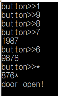 도어락 비밀번호를 입력받고 확인하는 프로그램입니다.마지막 5자리 입력이 특정 패턴과 일치하는지 확인하고, 그 결과에 따라 문을 여는지 경고를 출력합니다. 즉,한 줄에 하나씩 버튼을 입력 받고 4 번째 입력부터는 마지막 입력된 4 개의 버튼을 출력한다 ‘*’ 이 입력되면 문이 열리는지 열리지 않는지 출력하시오 문이 열리면 “door open!”, 열리지 않으면 “wrong 를 출력이를 C 언어로 구현하는 예제 입니다. #include #include #define _CRT_SECURE_NO_WARNINGS#define PASSCODE "9876*"int main() { char input[1000]; // 임의의 긴 입력을 저장할 배열 char lastFive[6] = ""; //..